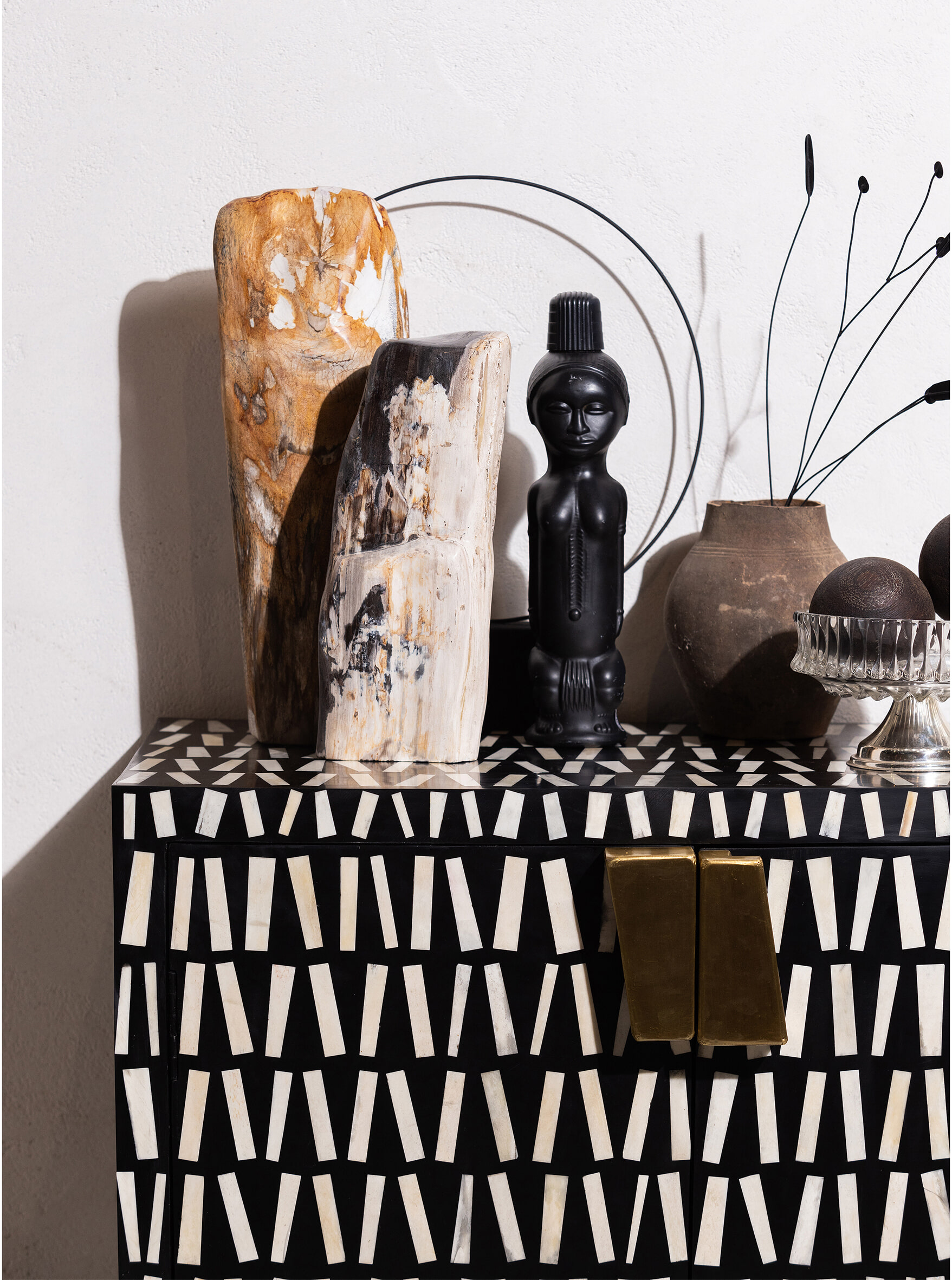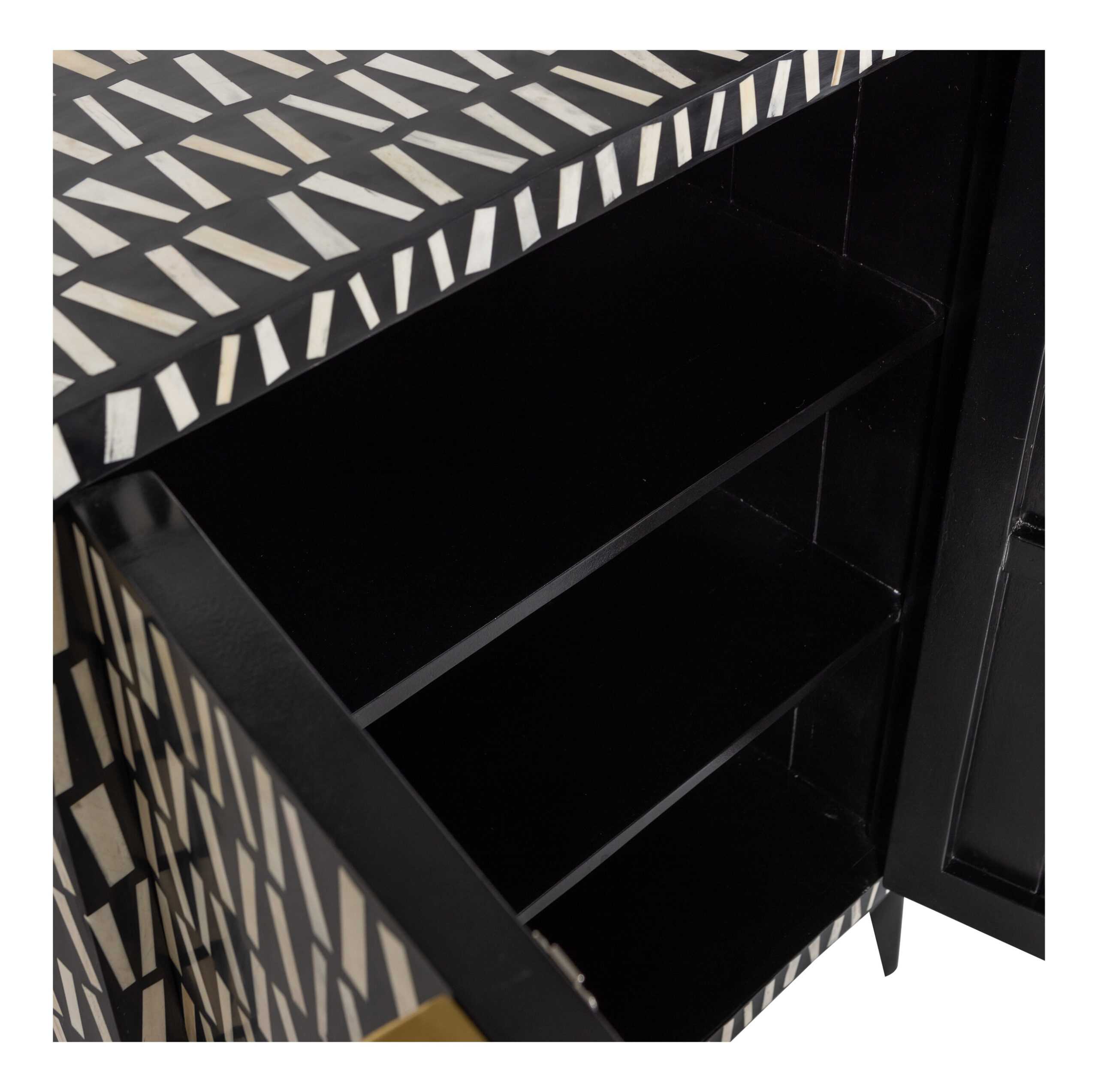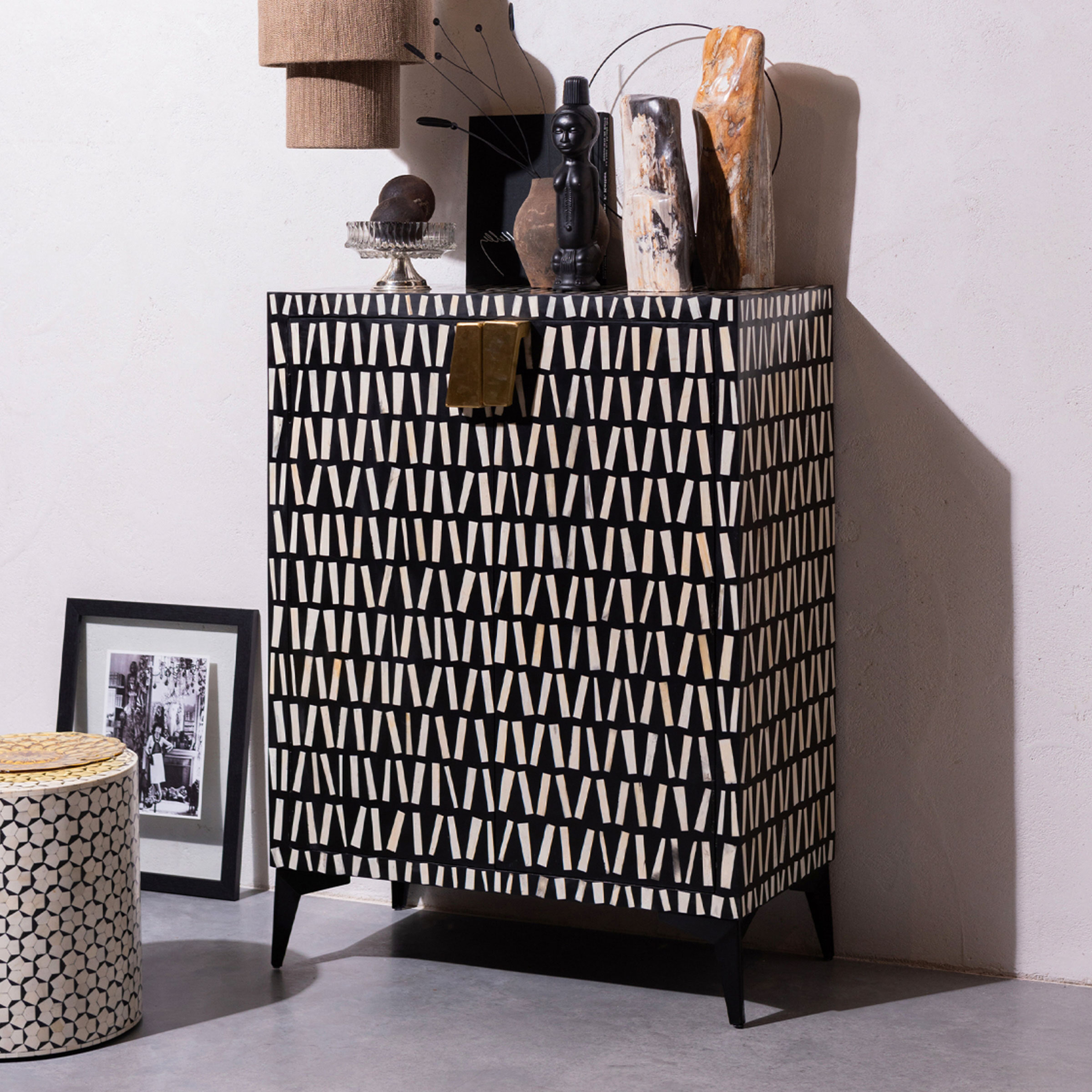 De Menne opbergkast, uit de Exclusive collectie van het Nederlandse interieurmerk WOOOD, is een ware blikvanger in huis en heeft bijzondere features. Zo is het frame van Menne gevormd uit matzwart mangohout en het onderstel van gepoedercoat metaal. Het unieke aan Menne is de buitenzijde met bone inlay, dit duurzaam ingewonnen materiaal is afkomstig vanuit slachtafval om zo dit unieke en opvallende interieurstuk te versieren!