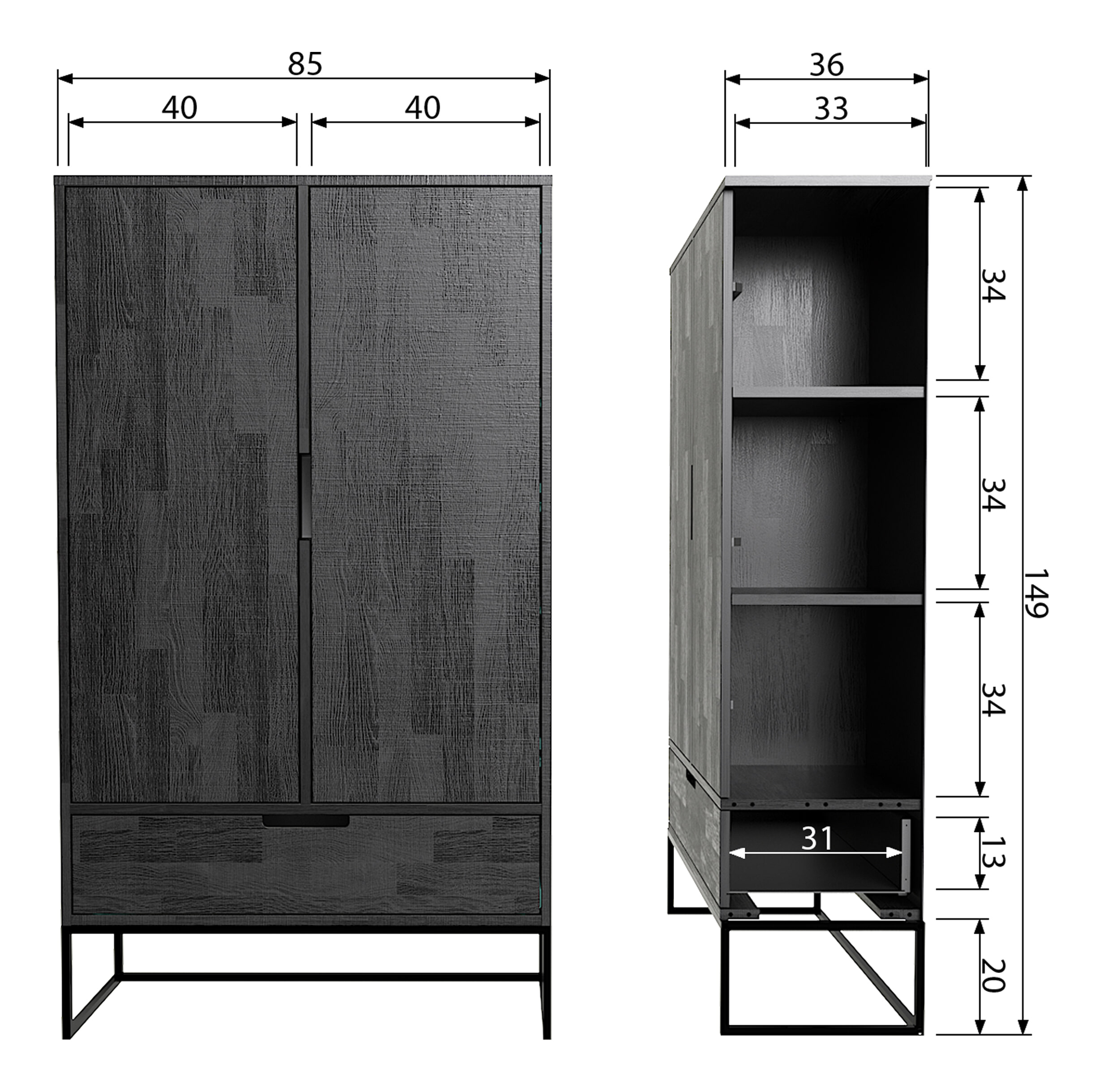 De Silas 2-deurs kast heeft een hoogte van 149 cm, een breedte van 85 cm en een diepte van 35.5 cm. De grote lade onderin heeft een diepte van 31 cm en een hoogte van 13 cm. De kast heeft 2 deuren, waar achter zich 2 legplanken over de breedte van de kast bevinden en het tussenschot heeft een inkeping zodat je de deuren kunt openen.