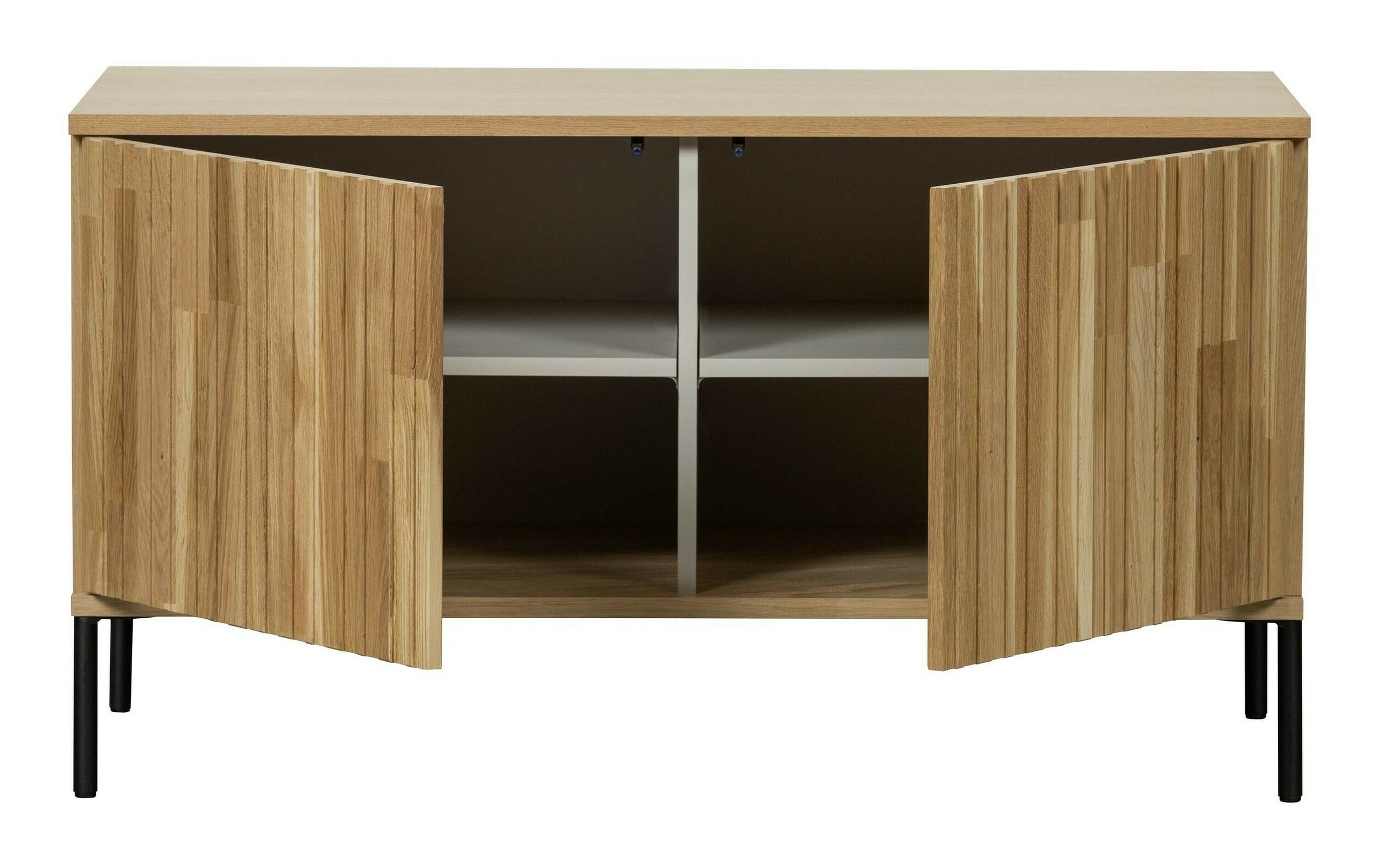 Onze succesvolle Gravure serie in een nieuw jasje! Dit Gravure New tv-meubel, uit de collectie van het Nederlandse interieurmerk WOOOD, is verkrijgbaar in twee formaten: 100 cm breed en 150 cm breed. Gravure New tv-meubel is uitgevoerd in eikenhout fineer met een blanke lak. Het interieur is vervaardigd uit spaanplaat in een mist grijze tint. De poten zijn van metaal met een zwarte coating. Het Gravure New tv-meubel beschikt over twee deuren met een geluidloos push-to-open systeem. Combineer je meerdere New Gravures naast elkaar? Verbind beide meubels dan eenvoudig met enkel één poot voor en één poot achter, stijlvol! Eikenhout is een natuurlijk materiaal wat wij graag extra benadrukken, de karaktervolle nerftekeningen is bij elk artikel anders. Hierdoor is elk meubel uniek.