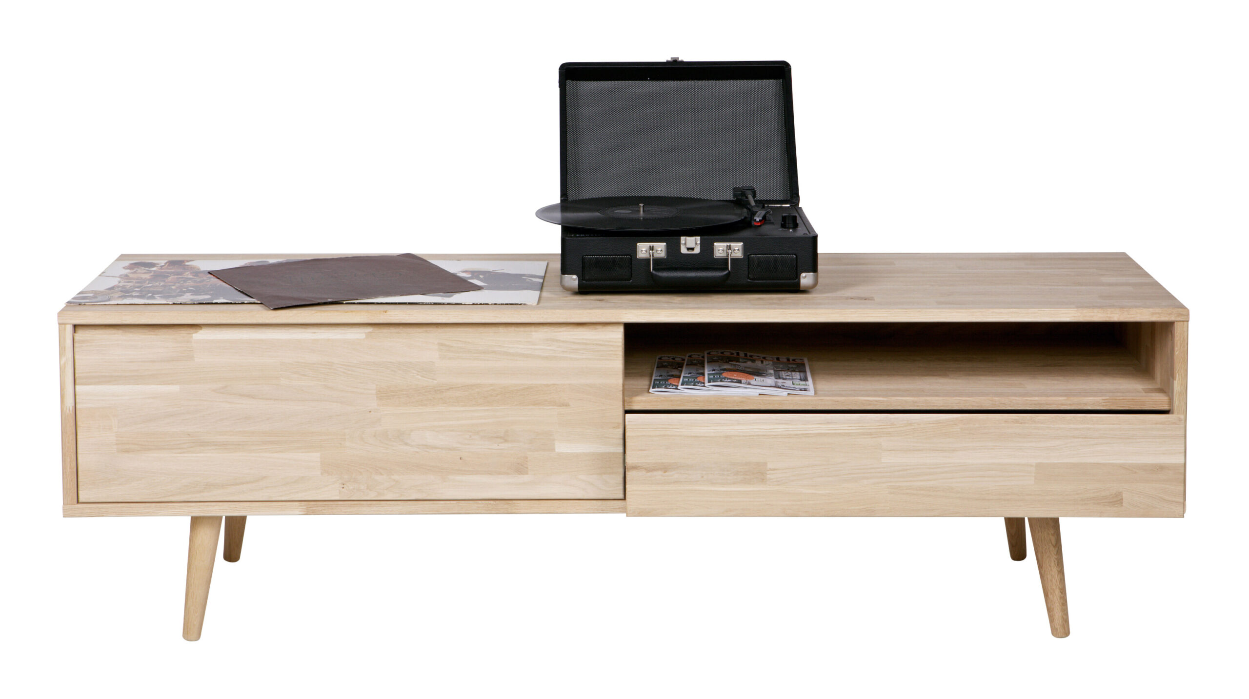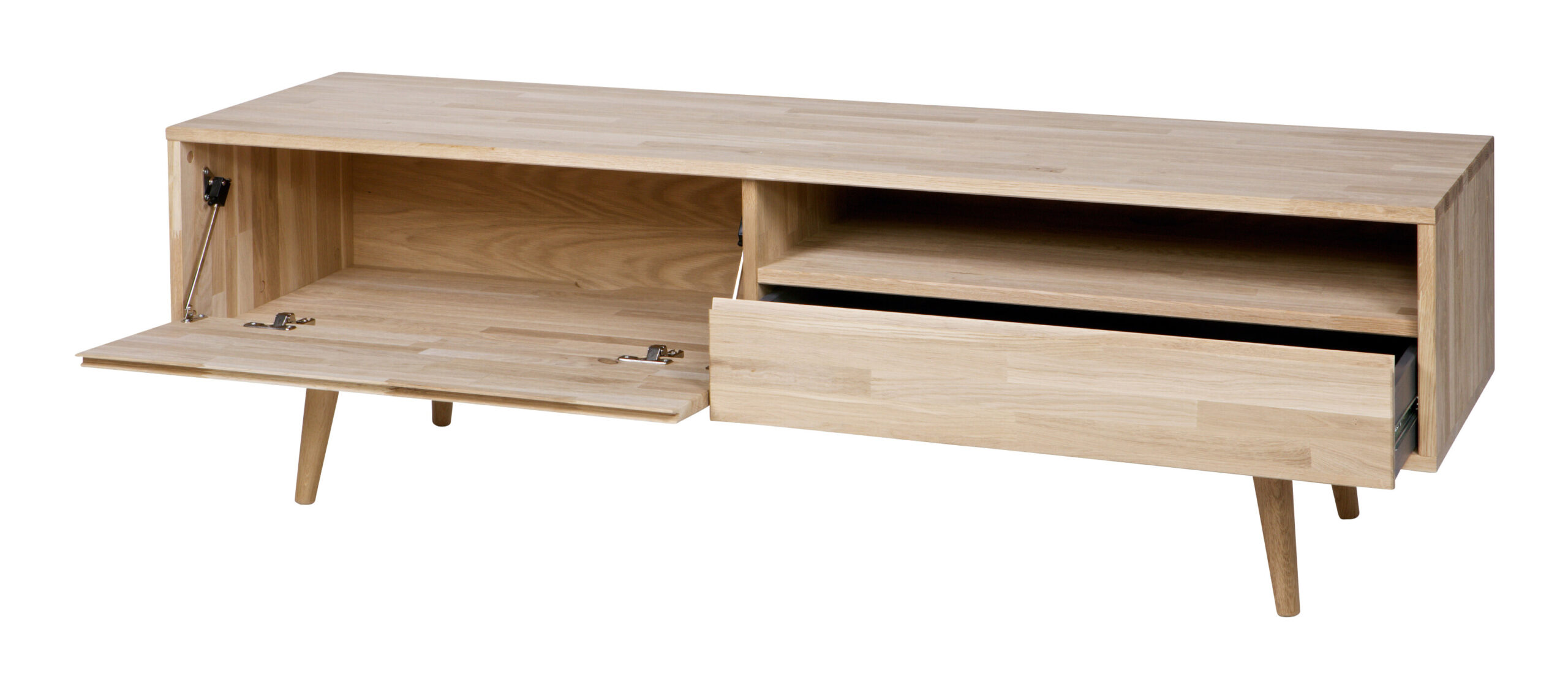 Een TV-audiomeubel die heel veelzijdig is. De afmetingen van dit meubel zijn (bxhxd): 150x47x44 cm. Het onbehandeld eiken bestaat uit stroken verlijmd eikenhout. Ter bescherming van het meubel wordt geadviseerd het eiken te behandelen met meubelolie of lak. Het TV-audiomeubel is ook verkrijgbaar in de breedte 100 cm.