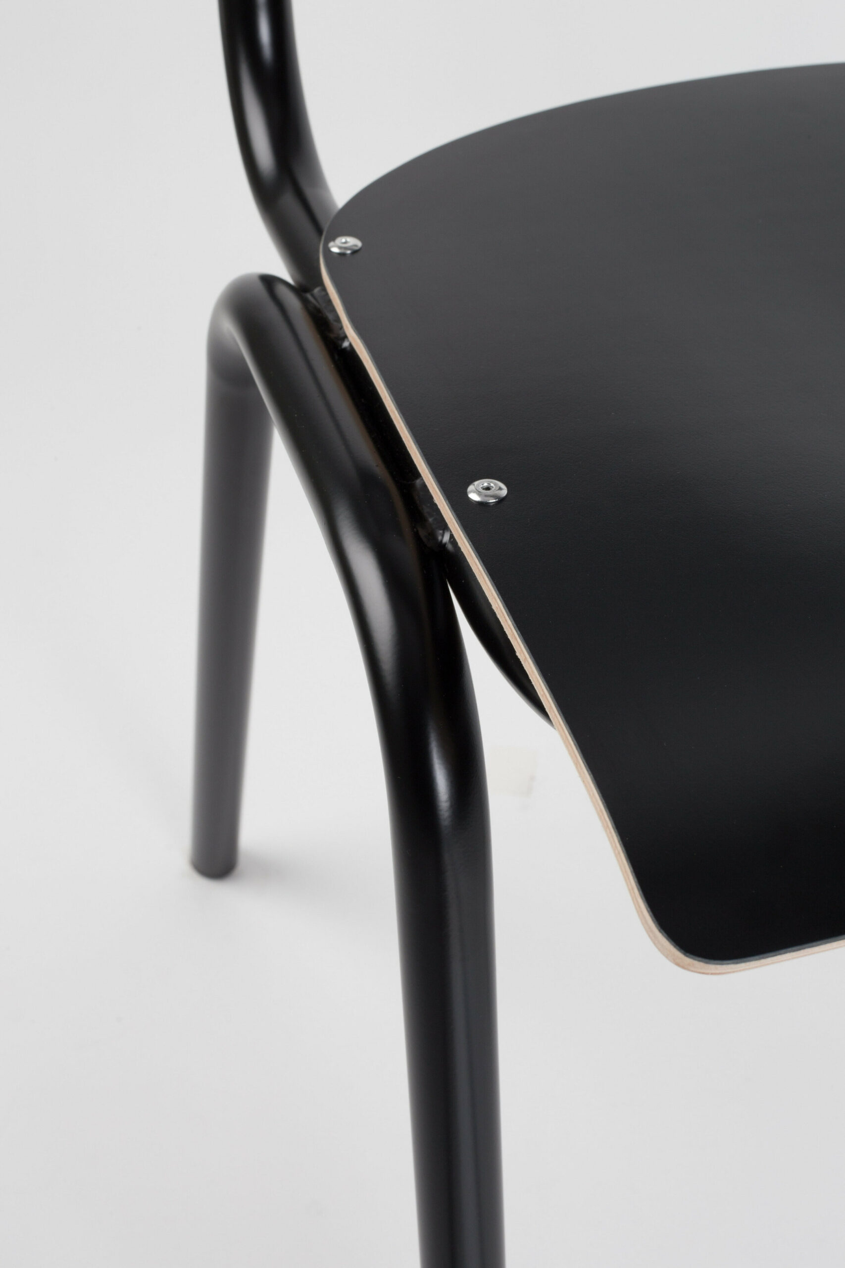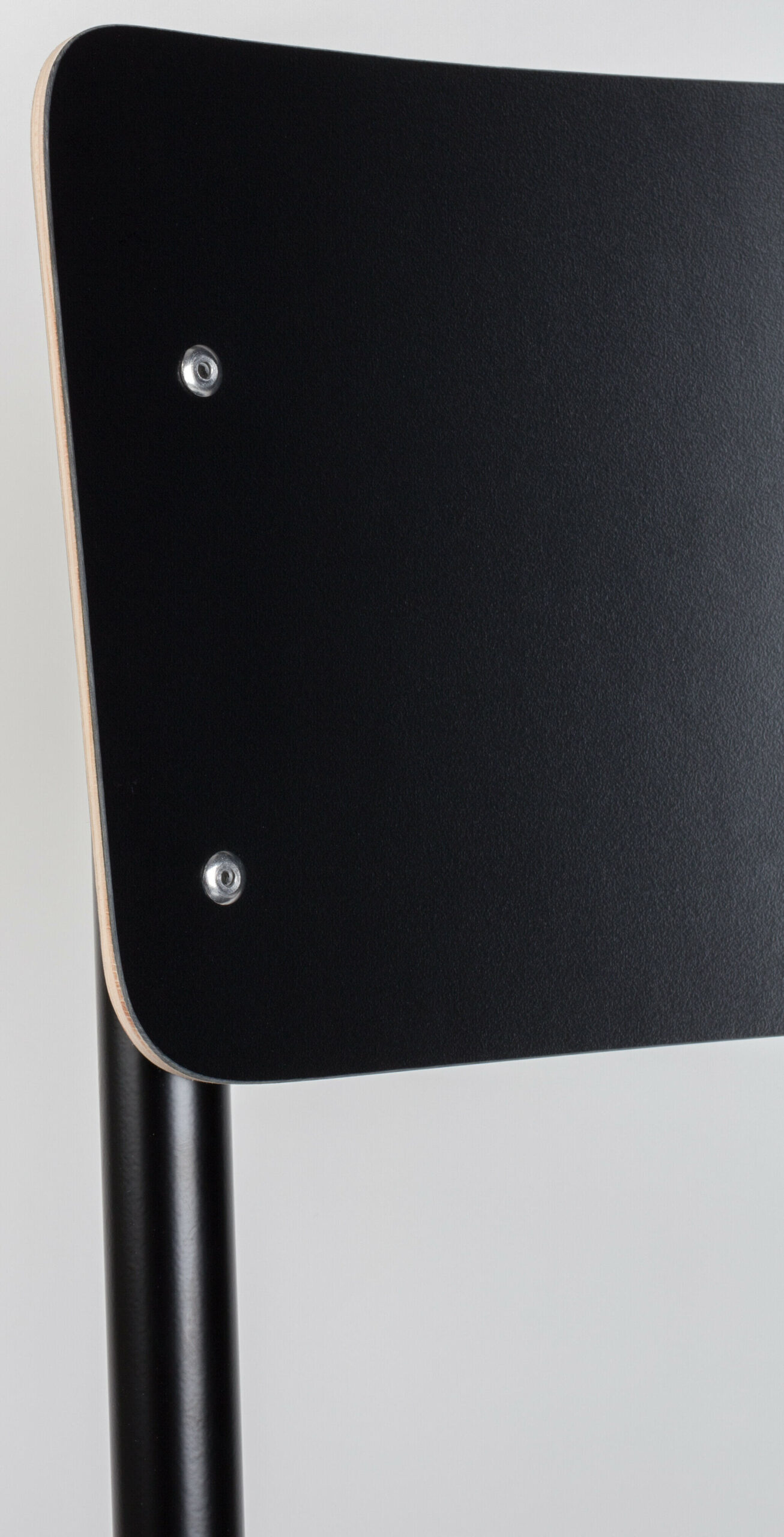 - Materiaal: Rugleuning en zitting van multiplex met HPL toplaag. Stalen frame, gepoedercoat.