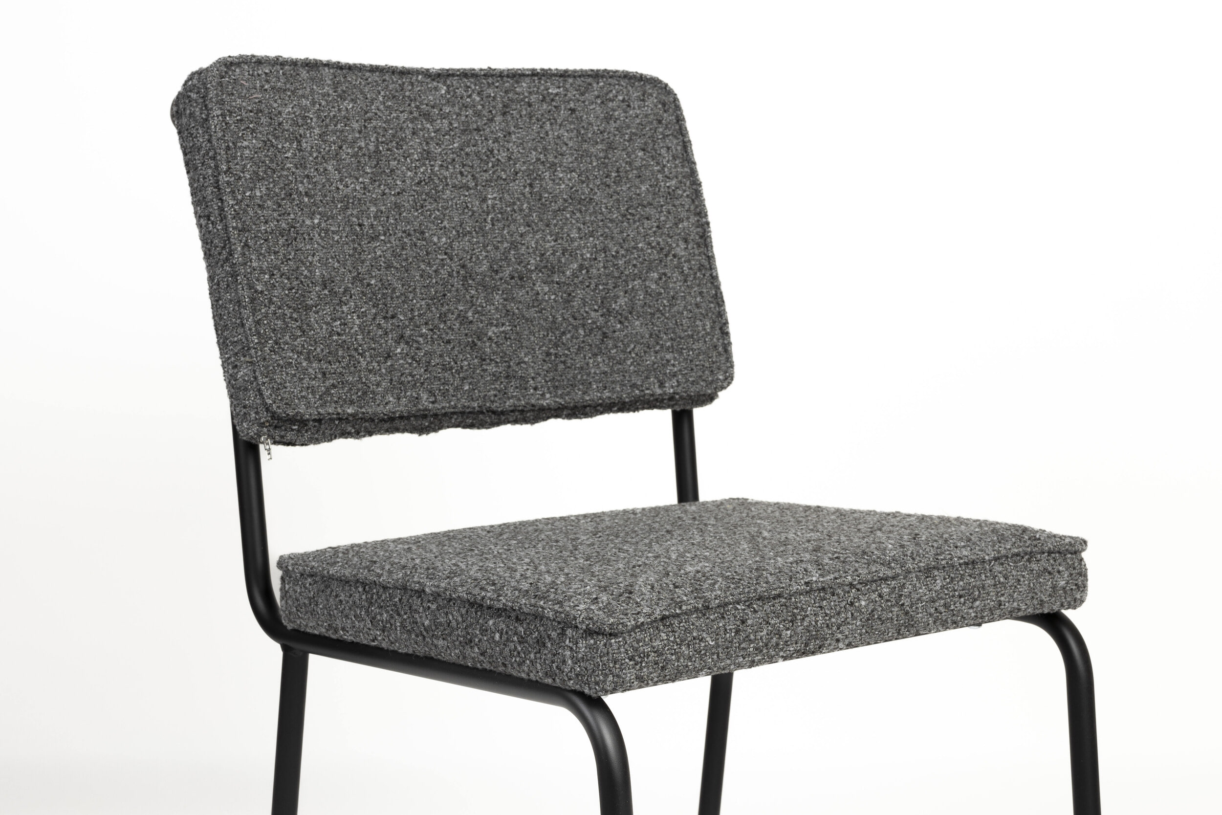 De Buddy stoel is gemaakt met het oog op comfort en heeft een lichtgewicht frame met zachte bekleding van boucléstof. De bekleding is gemaakt van 100% gerecycled materiaal. Het frame van de stoel loopt naadloos over in de greep aan de achterkant. Dit ergonomische detail zorgt voor gemakkelijk verplaatsen en voegt een vleugje verfijning toe.