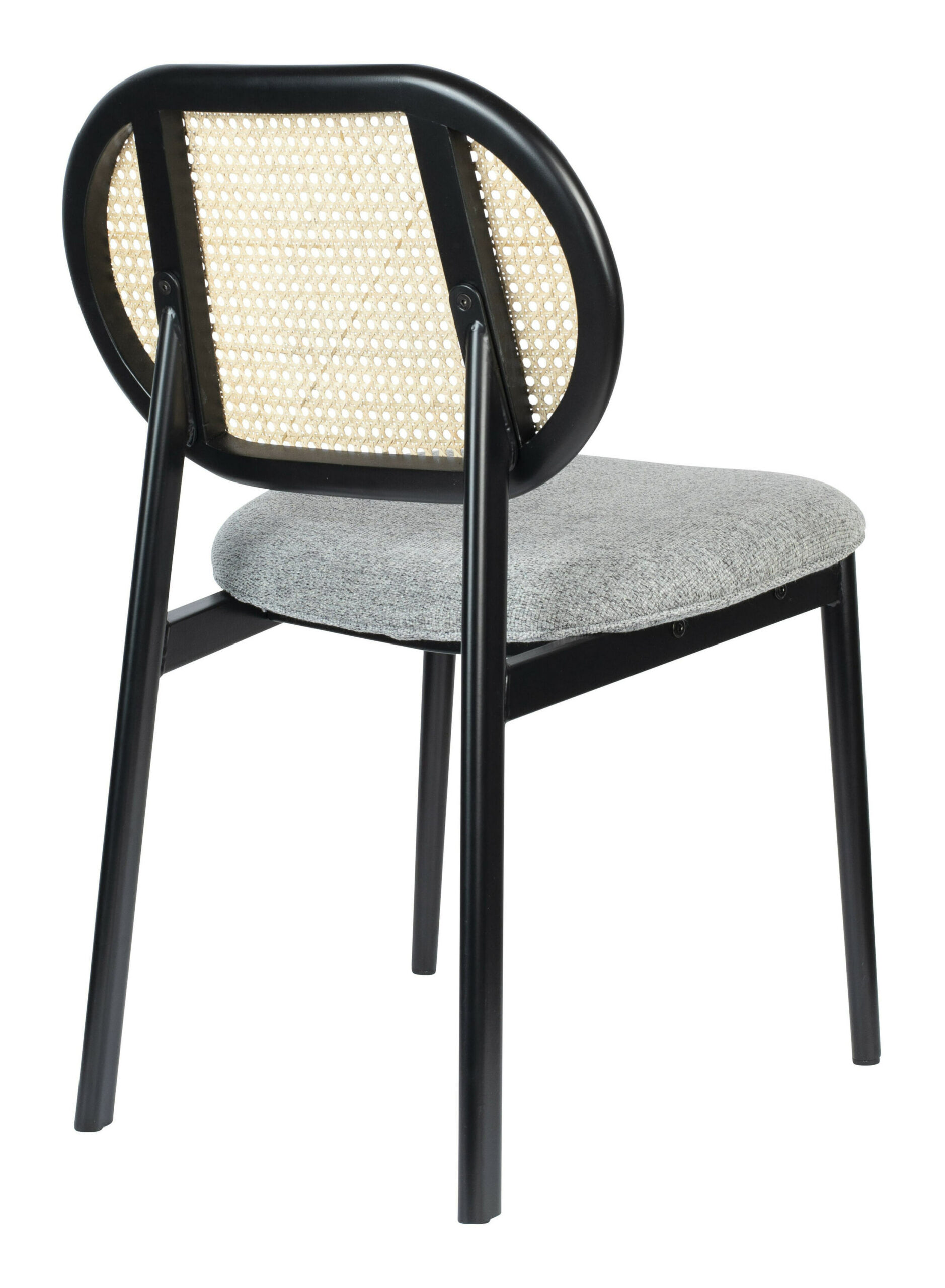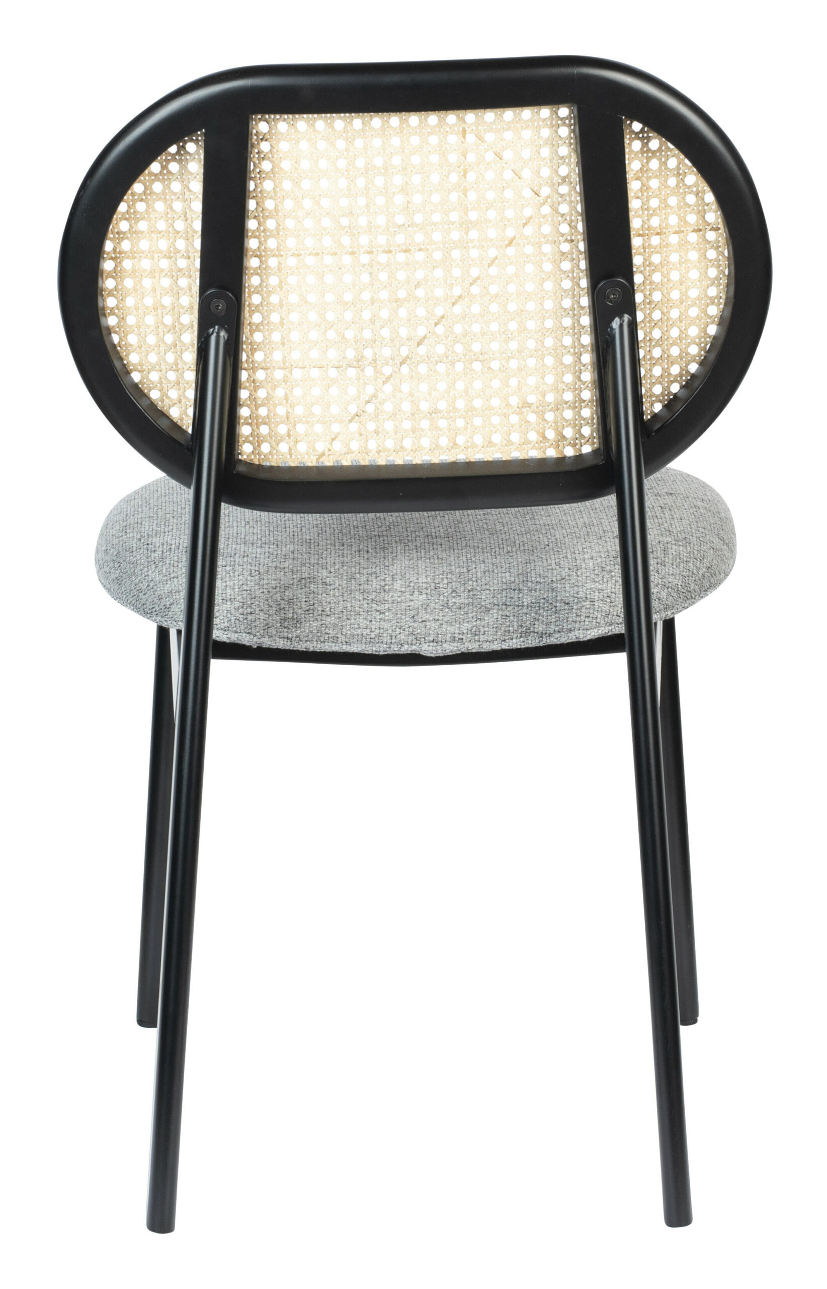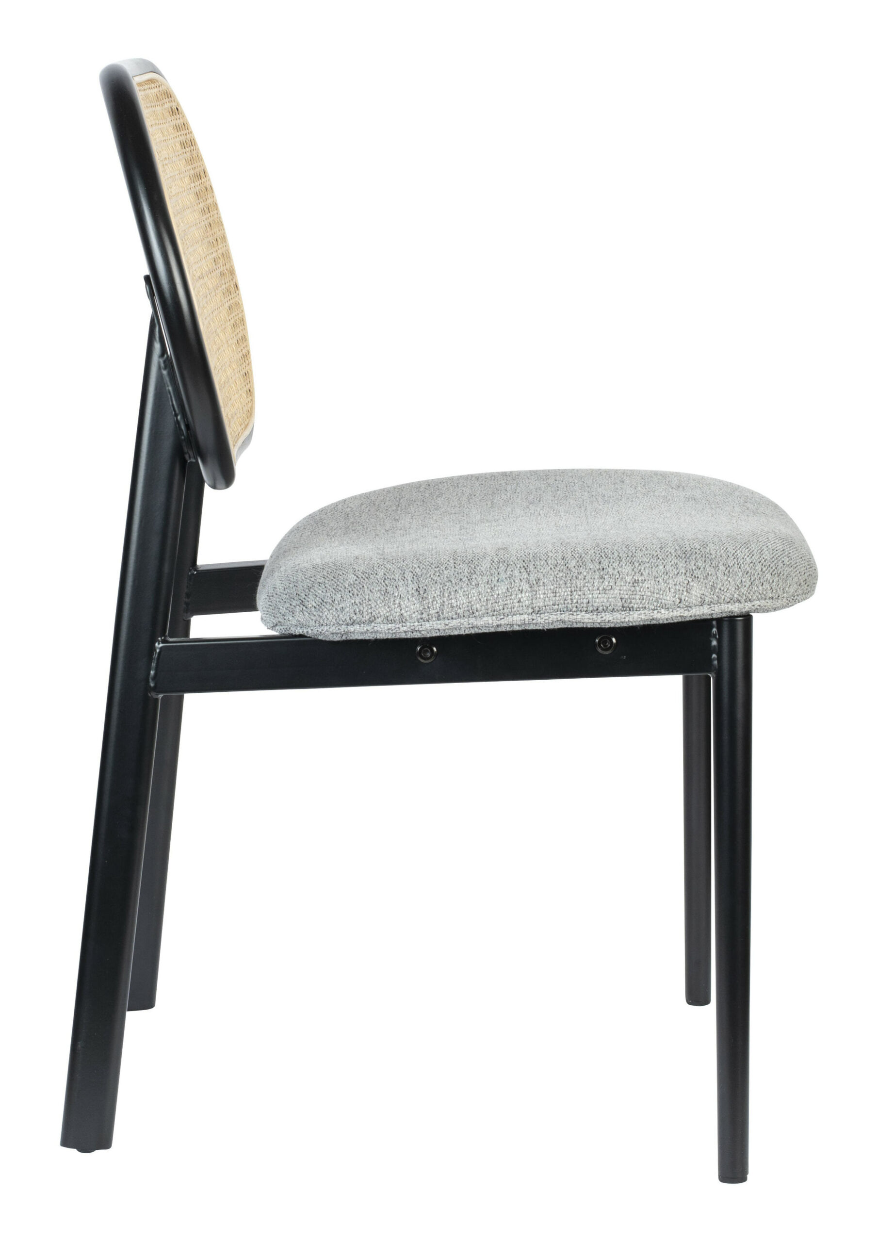 - Materiaal: Rattan rug in massief beukenhouten gelakt frame. 100% polyester stof, PU schuim en multiplex zitting. Gepoedercoate stalen poten met PP voetdoppen.