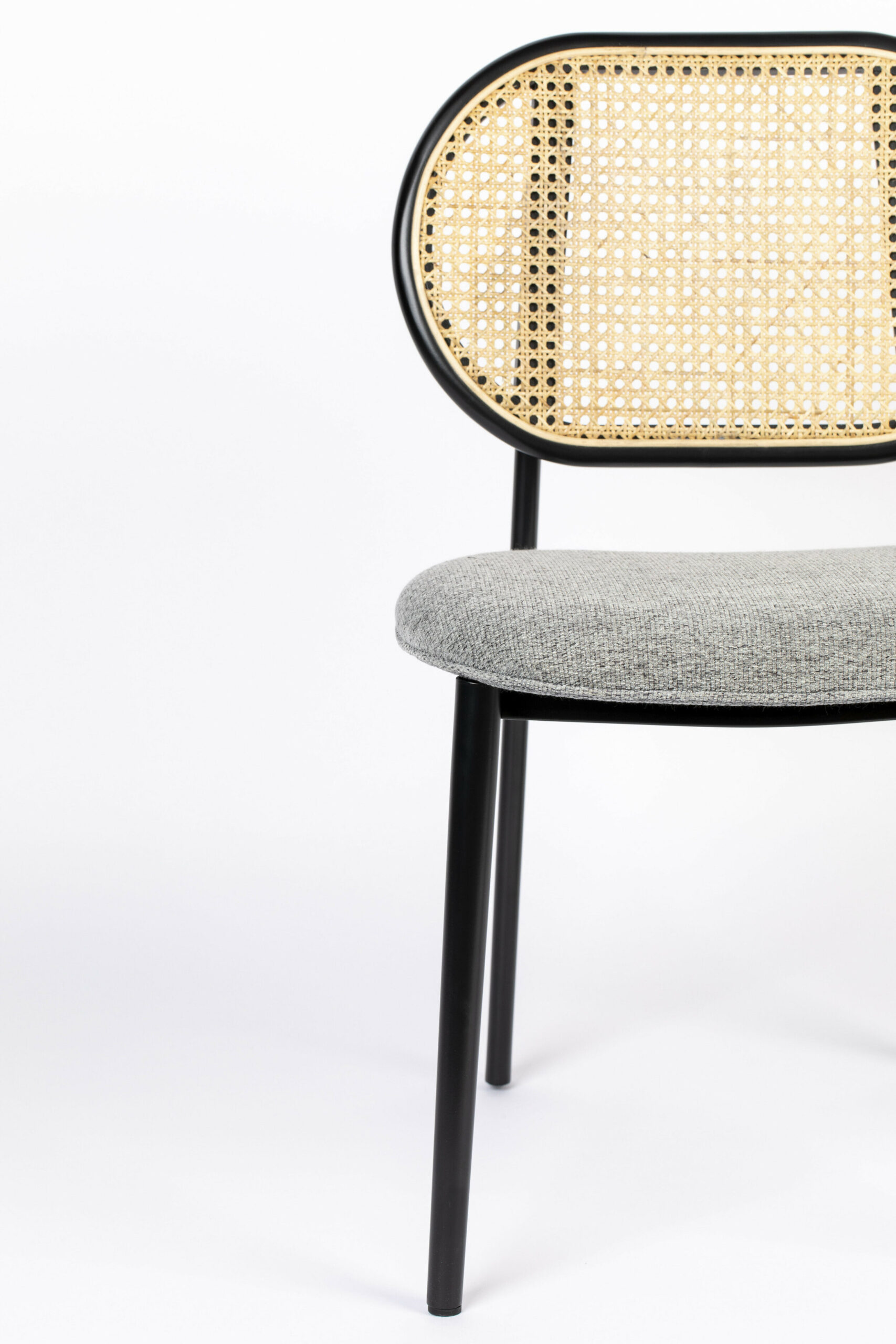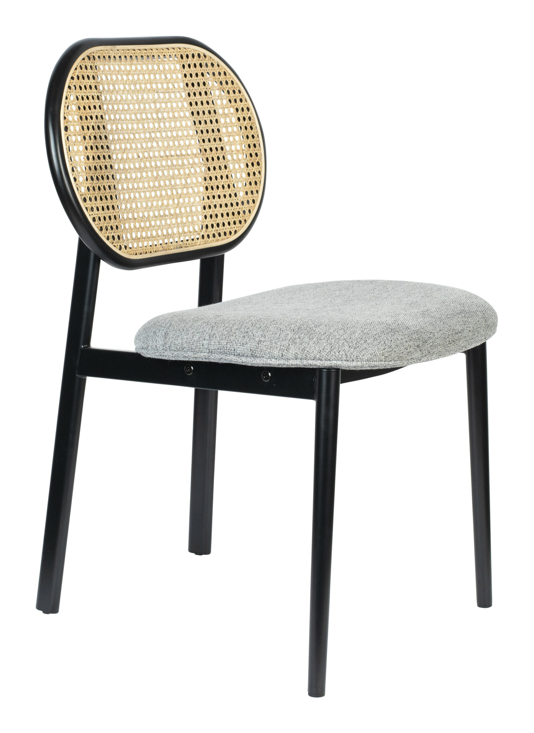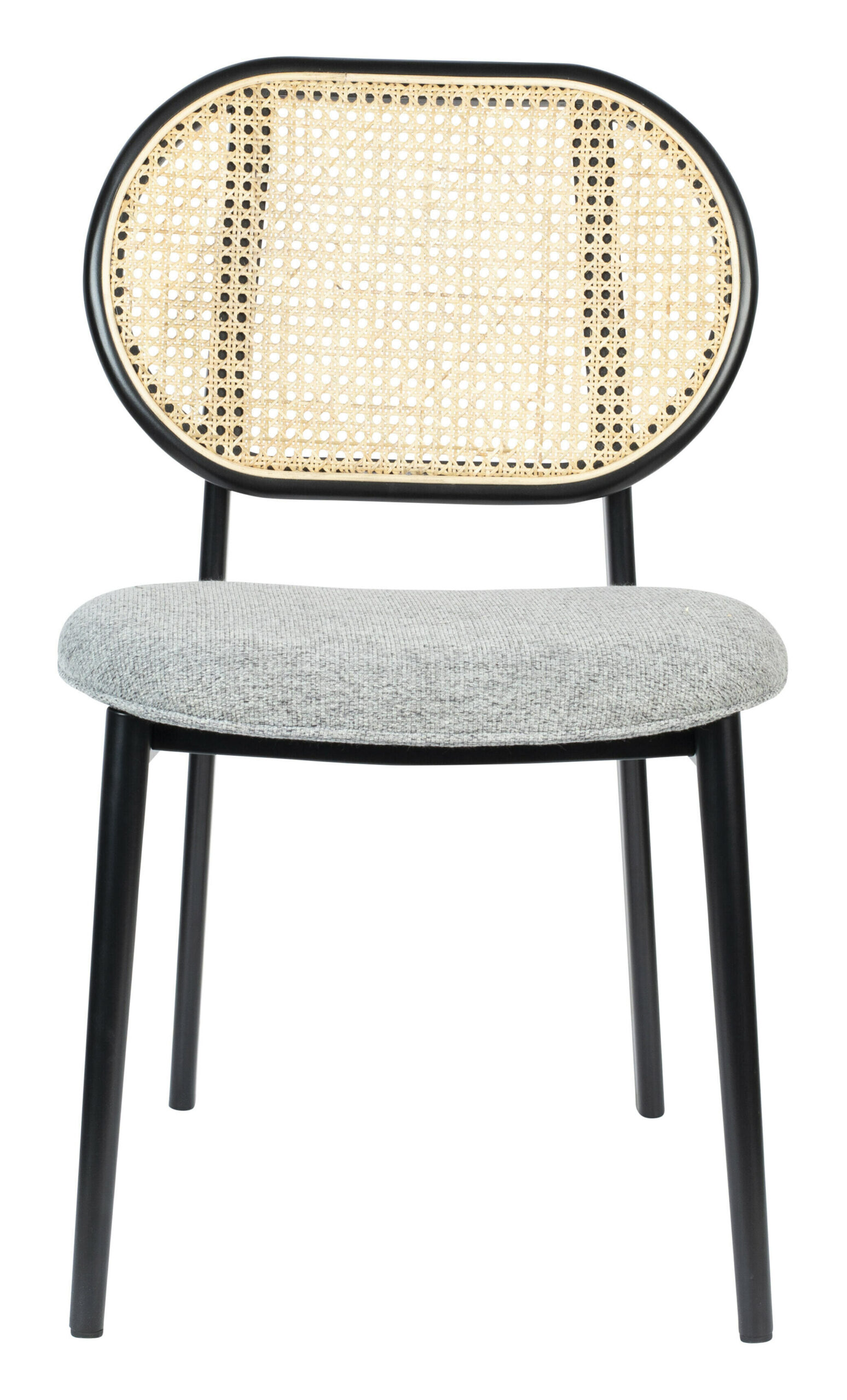 - Materiaal: Rattan rug in massief beukenhouten gelakt frame. 100% polyester stof, PU schuim en multiplex zitting. Gepoedercoate stalen poten met PP voetdoppen.