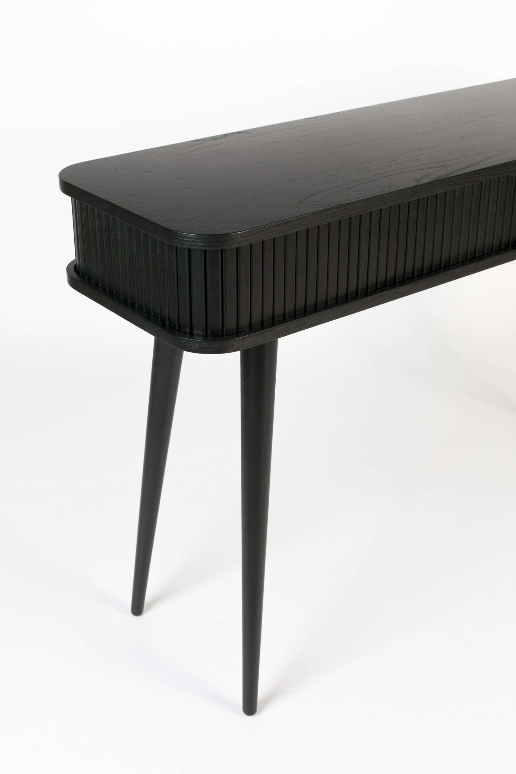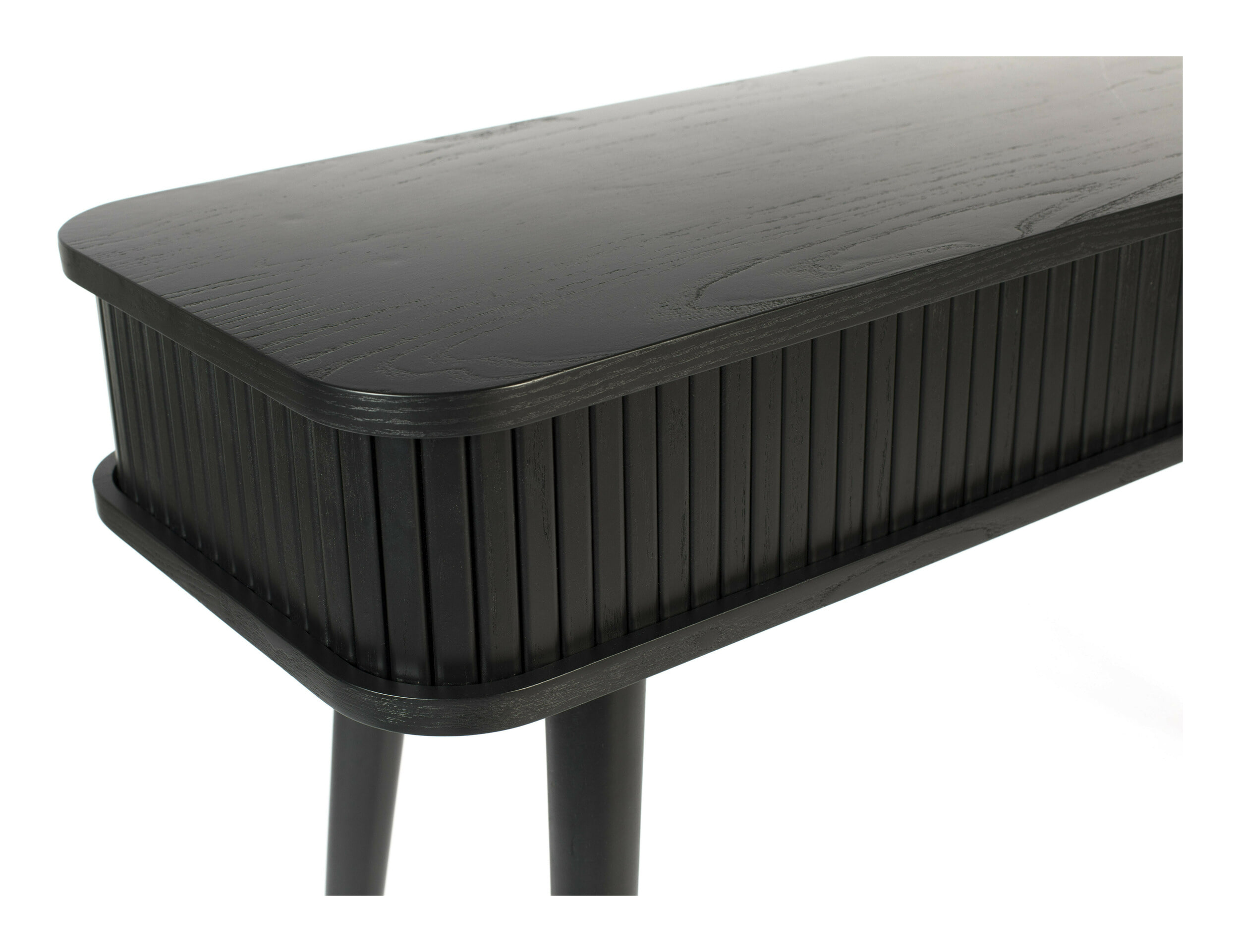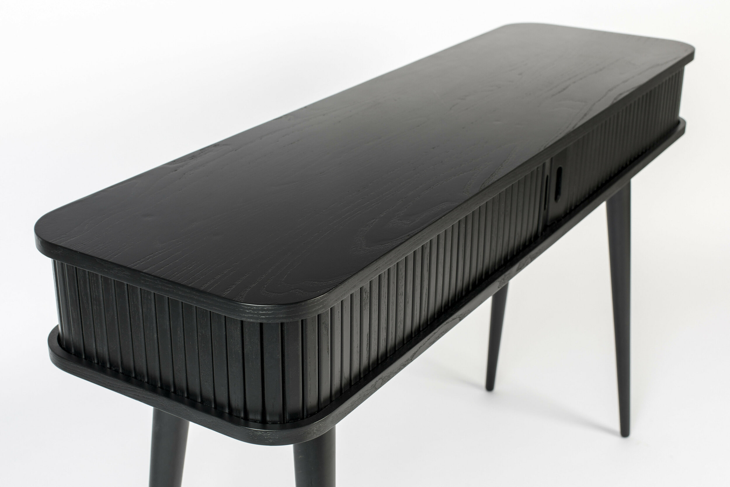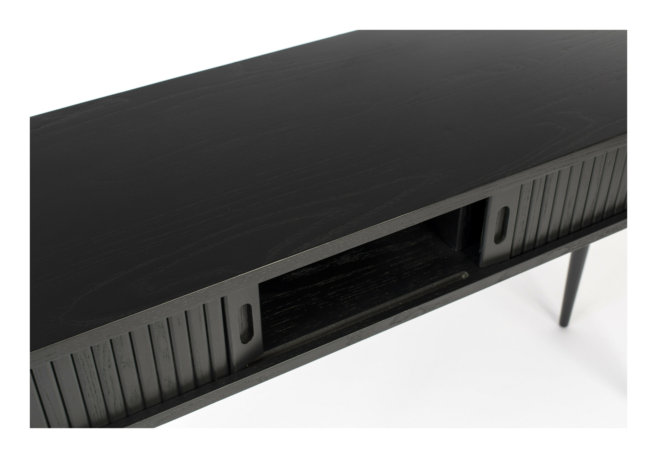 - Materiaal: Boven- en onderkant MDF met zwart eikenfineer, binnenpanelen MDF met folie. Gelakte massief rubberen houten poten en rolblad van essen gefineerd MDF. Afgewerkt met blanke PU-lak.